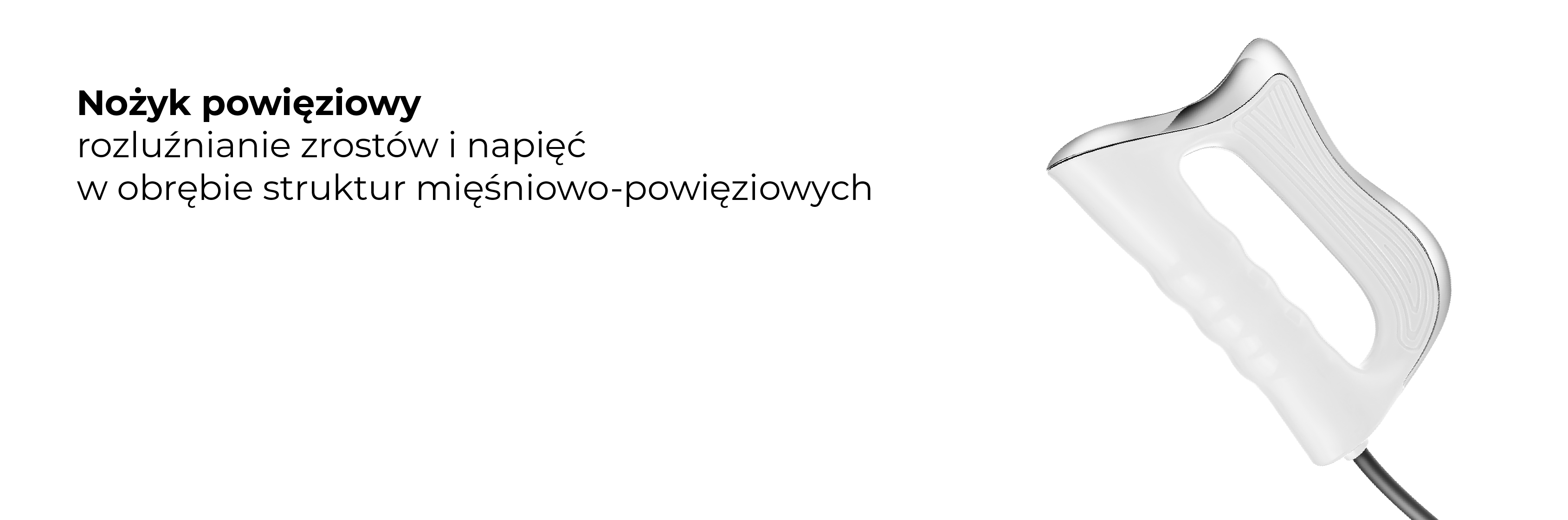 Dodatkowa głowica powięziowa: kształtem przypomina ergonomiczny nożyk, co pozwala na precyzyjną mobilizację tkanek i rozluźnianie zrostów powięziowych.