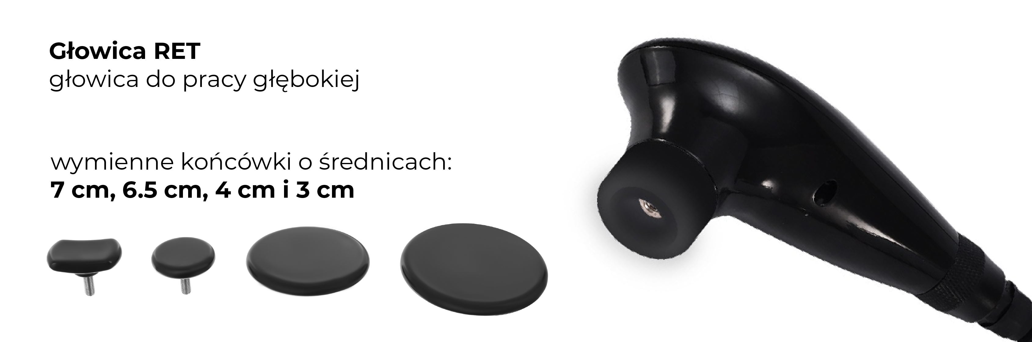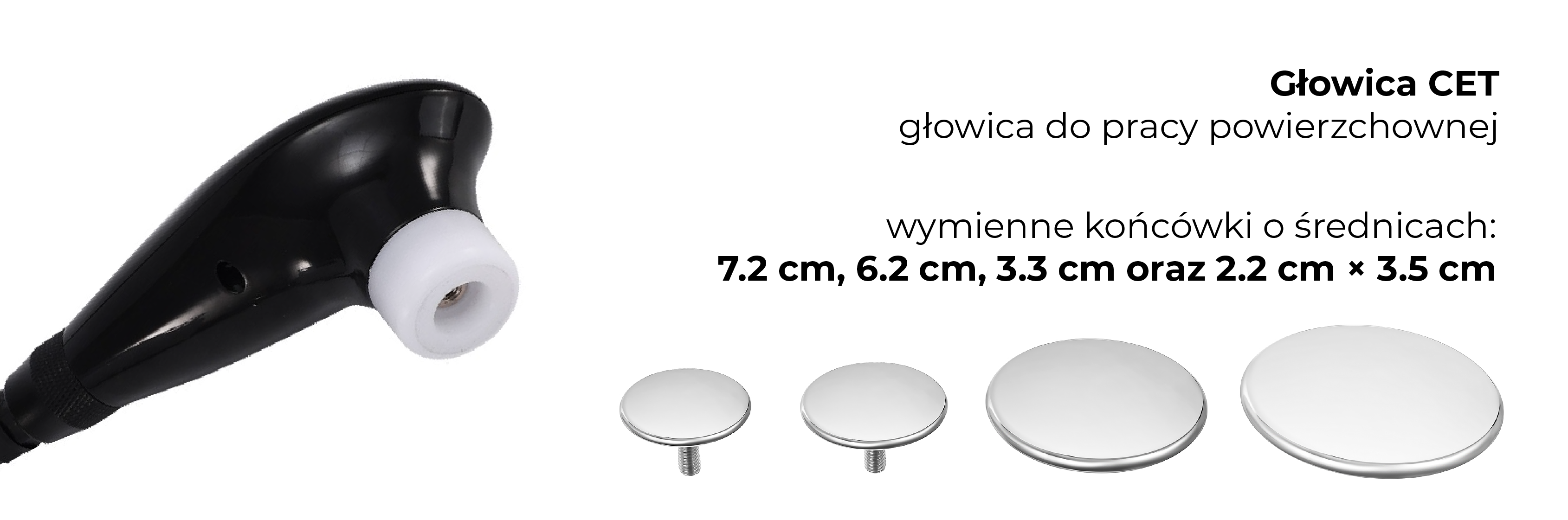 Końcówki zabiegowe: RET (intensywna praca) 7.2 cm, 6.2 cm, 3.3 cm, 2.2 cm x 3.5 cm,