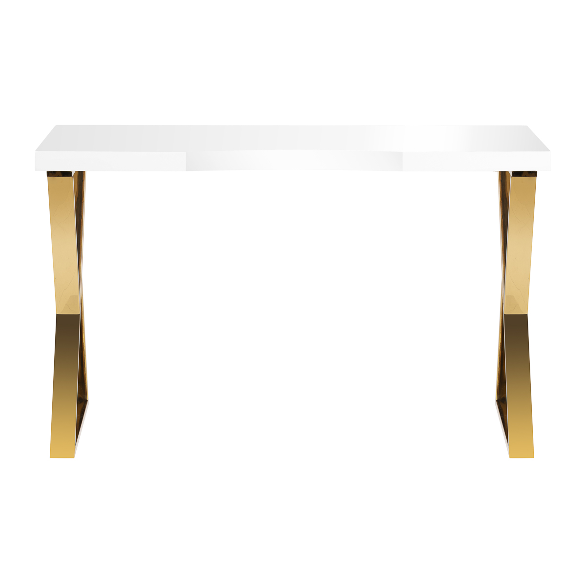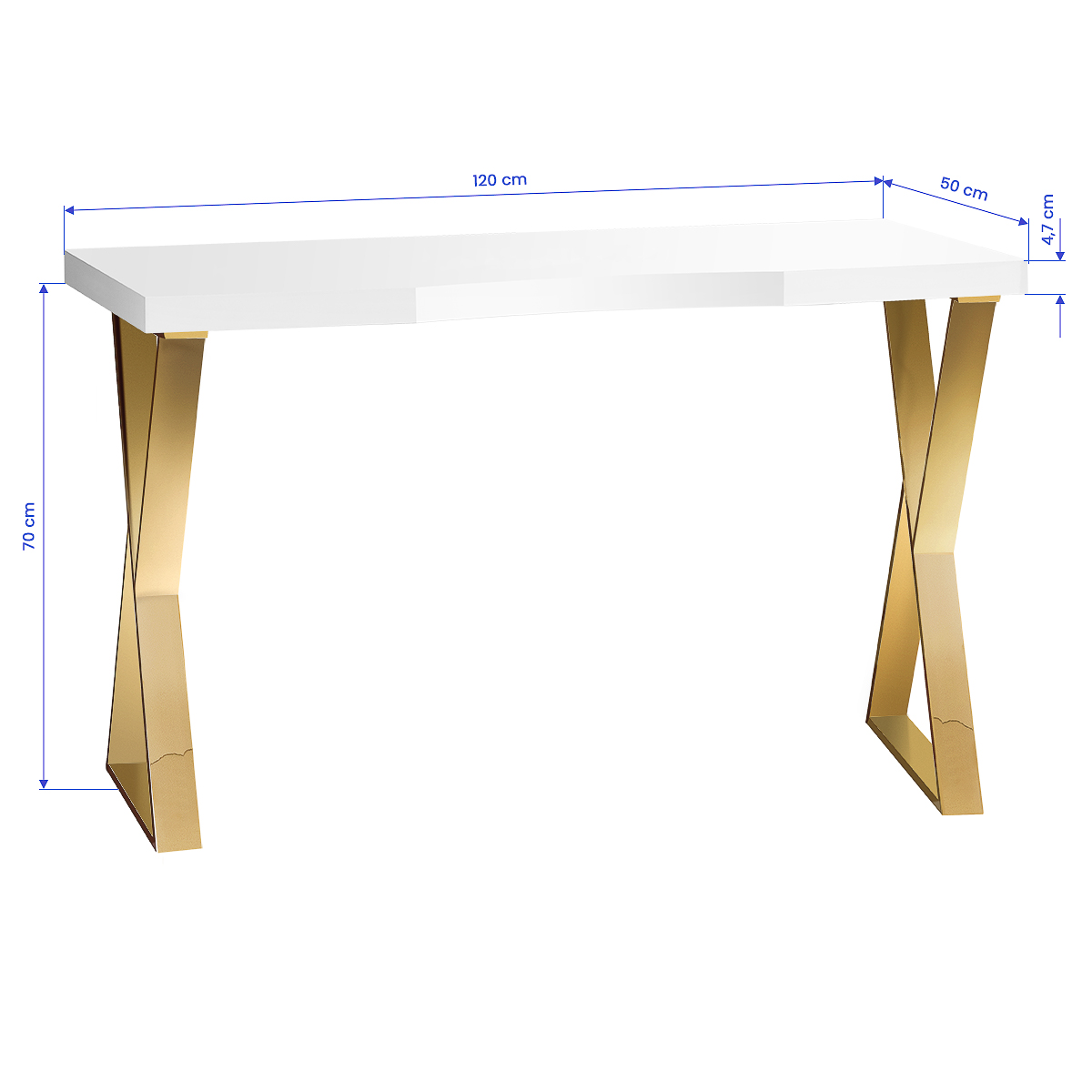 Biały blat na wysoki połysk oraz geometryczne, złote nogi nadają mu lekkości i nowoczesnego charakteru. Dzięki swojej lekkiej formie biurko sprawdzi się zarówno w kameralnych, jak i przestronnych wnętrzach, podkreślając ich ekskluzywny charakter. To doskonała inwestycja w estetykę oraz komfort codziennej pracy.