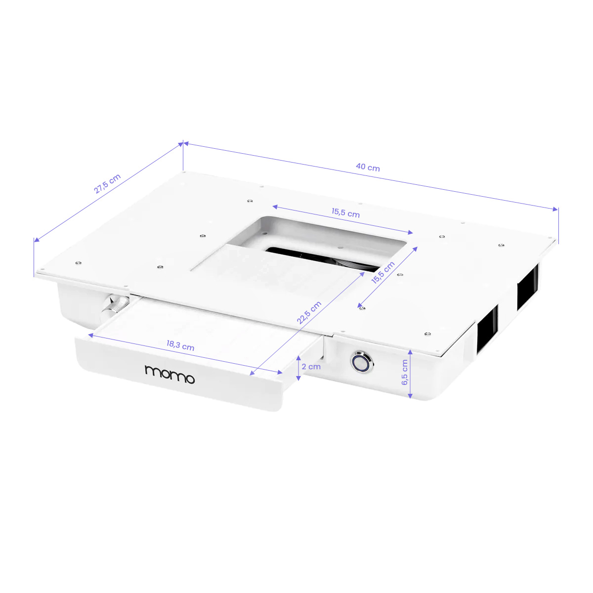 Kasetowy pochłaniacz pyłu Momo J-02 wbudowany w blat znacząco poprawia komfort i higienę pracy, skutecznie usuwając pył powstały podczas zabiegów kosmetycznych, takich jak manicure. Dzięki temu urządzeniu powietrze w salonie pozostaje czyste, a miejsce pracy wolne od zanieczyszczeń, co zwiększa bezpieczeństwo zarówno dla kosmetyczki, jak i klientów. Pochłaniacz pyłu jest łatwy w obsłudze i konserwacji, co dodatkowo podnosi jego funkcjonalność. Regularne czyszczenie oraz wymiana filtra zapewniają niezmiennie wysoką skuteczność pochłaniania. Istnieje możliwość zakupu dodatkowych filtrów wymiennych (SKU 123581). W naszym sklepie dostępny jest również filtr z aktywnym węglem (SKU 123582), który skutecznie eliminuje alergeny i drobnoustroje, podnosząc poziom higieny w salonie.