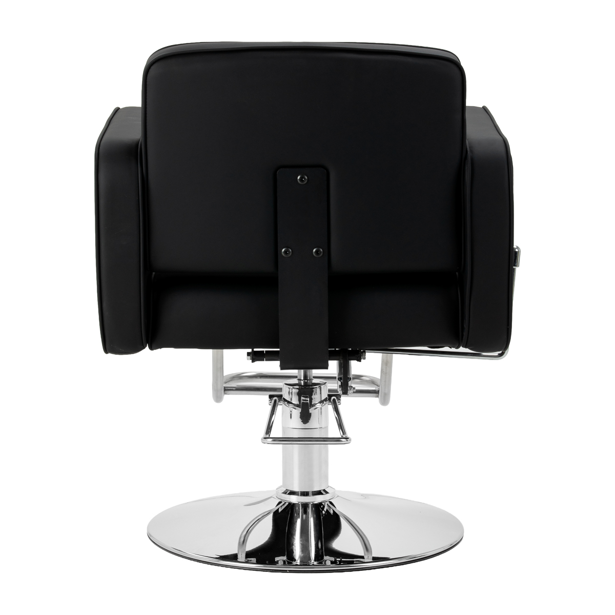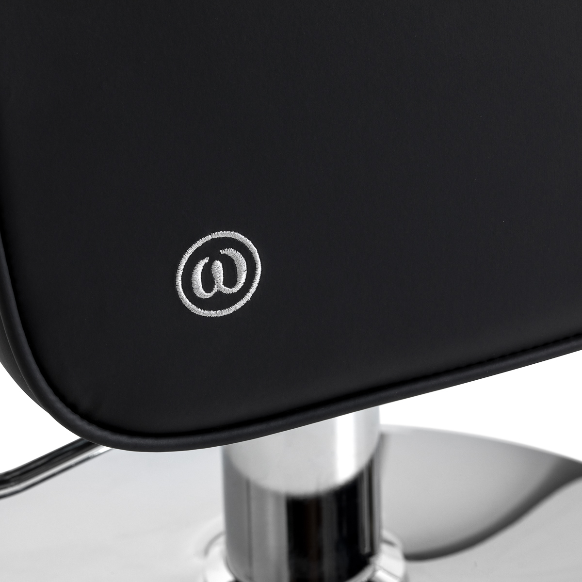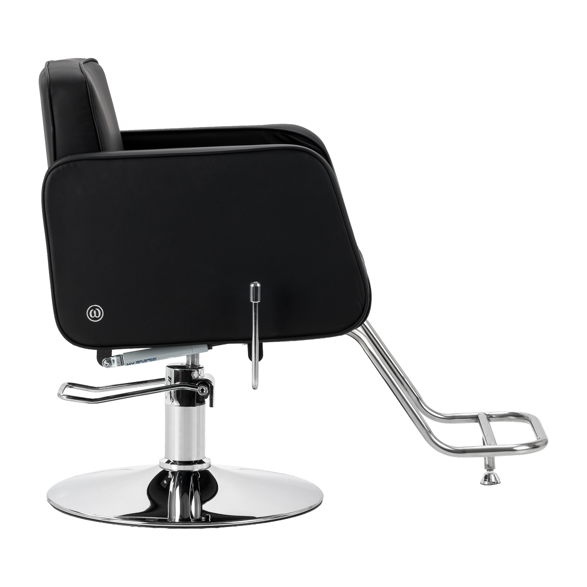 Model wyróżnia się nowoczesnym designem, który podkreśla profesjonalny charakter salonu. Tapicerka z wysokiej jakości skóry syntetycznej w klasycznej czerni nadaje całości elegancki wygląd, a jej powierzchnia wyróżnia się odpornością na wilgoć oraz łatwością utrzymania w czystości. Okrągła podstawa oraz metalowy podnóżek podkreślają nowoczesny styl fotela, tworząc spójną formę dopasowaną do różnorodnych aranżacji wnętrz.