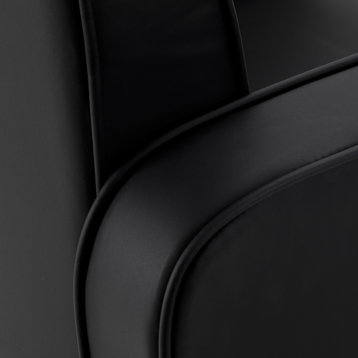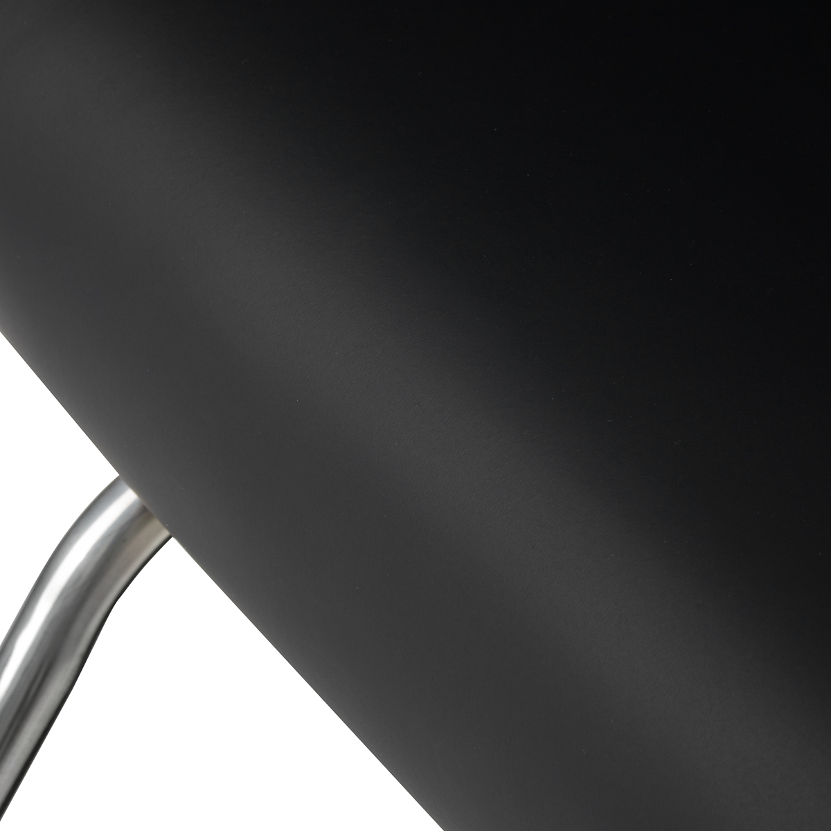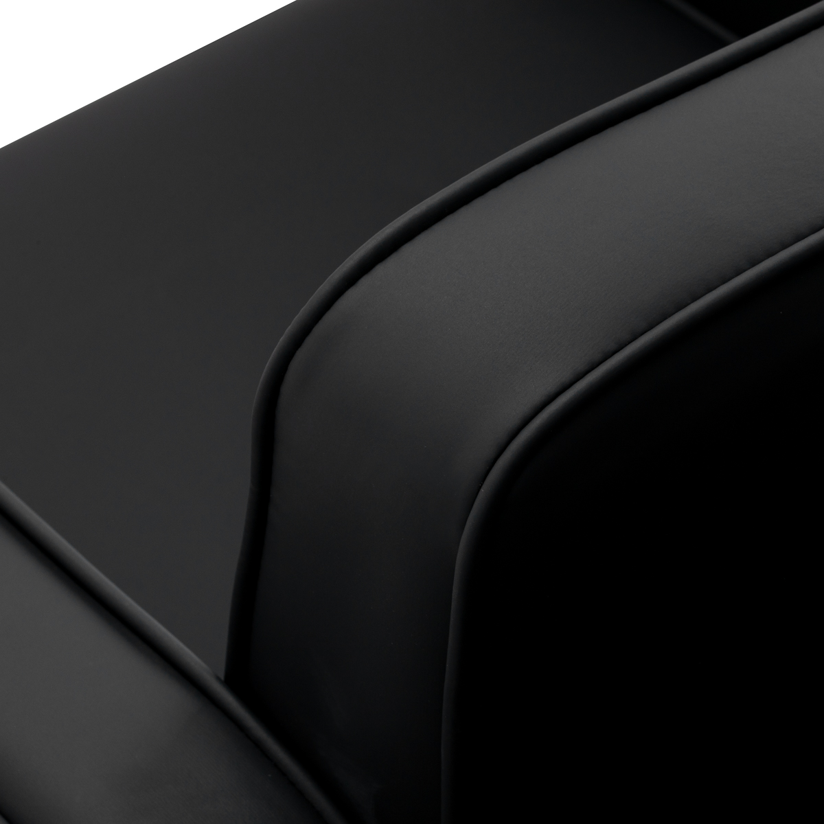 Model wyróżnia się nowoczesnym designem, który podkreśla profesjonalny charakter salonu. Tapicerka z wysokiej jakości skóry syntetycznej w klasycznej czerni nadaje całości elegancki wygląd, a jej powierzchnia wyróżnia się odpornością na wilgoć oraz łatwością utrzymania w czystości. Okrągła podstawa oraz metalowy podnóżek podkreślają nowoczesny styl fotela, tworząc spójną formę dopasowaną do różnorodnych aranżacji wnętrz.