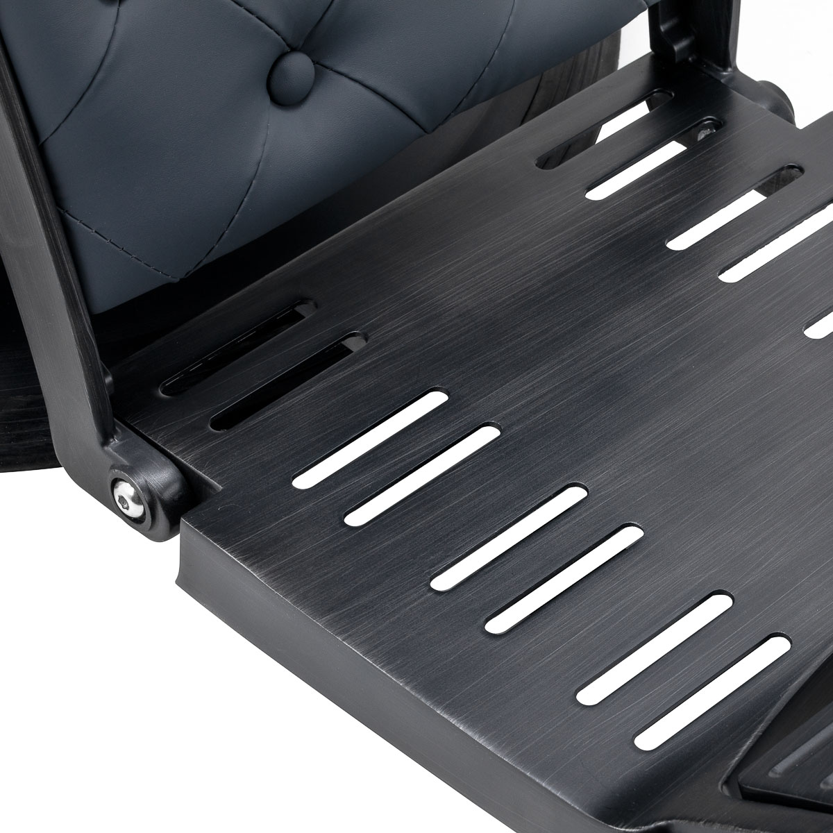 Stabilna konstrukcja podstawy z elementami w odcieniach czerni zapewnia wysoki komfort użytkowania. Wypełnienie z trwałej, odpornej na odkształcenia pianki oraz obicie wykonane z przyjemnej w dotyku skóry syntetycznej zapewniają trwałość mebla i jego komfortowe użytkowanie przez długi czas. Sprawiają również, że sprzęt jest odporny na wilgoć, wytrzymały oraz łatwy do czyszczenia. Pokrycie w odcieniach grafitu wraz z oryginalnym pikowaniem i ozdobnymi guzikami nadają mu wyjątkowego charakteru. Designerskie elementy dekoracyjne inspirowane motocyklami, nawiązujące do stylu vintage, doskonale wpasują się w klimat salonów barberskich, tworząc ich niesamowitą atmosferę.