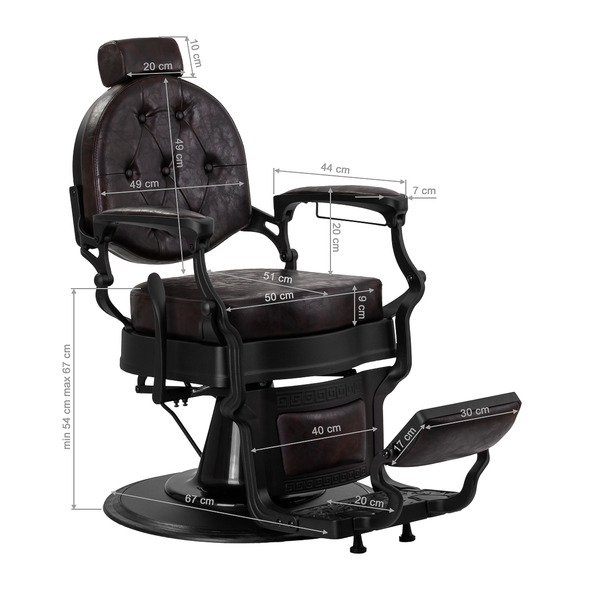 Solidna konstrukcja podstawy zapewnia stabilność oraz wysoki komfort użytkowania. Wypełnienie siedziska z trwałej, odpornej na odkształcenia pianki oraz obicie wykonane z przyjemnej w dotyku skóry syntetycznej o półmatowym wykończeniu zapewniają trwałość mebla i jego komfortowe użytkowanie przez długi czas. Sprawiają również, że sprzęt jest odporny na wilgoć, wytrzymały oraz łatwy do czyszczenia. Pokrycie w odcieniach brązu z pikowaniem i ozdobnymi guzikami nadaje mu wyjątkowego charakteru. Fotel o charakterystycznym designie, nawiązującym do stylu vintage, doskonale wpasowuje się w klimat salonów barberskich, podkreślając ich wyjątkową atmosferę.