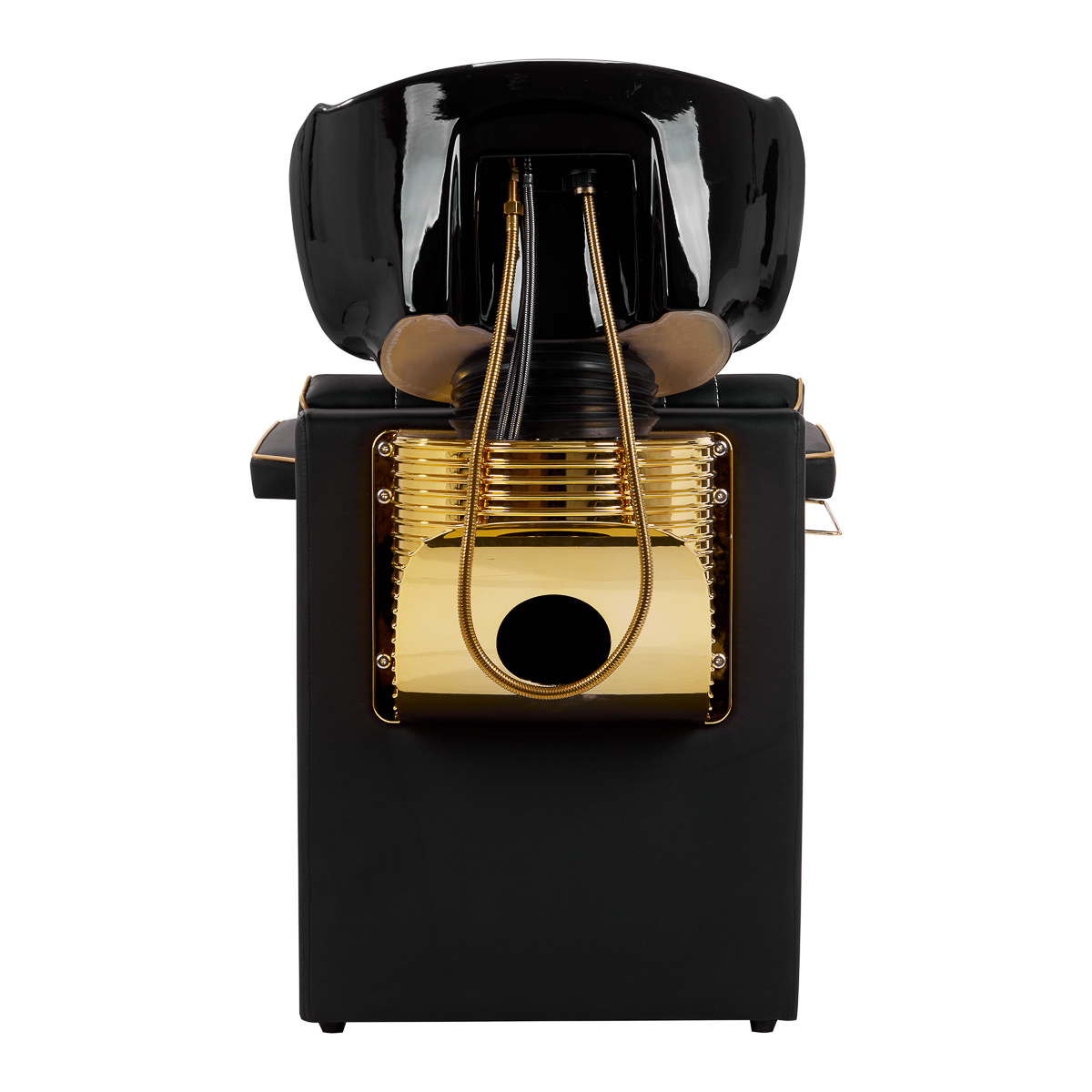 Odpowiednio wyprofilowany fotel wypełniony trwałą pianką zapewnia wsparcie lędźwi, a co za tym idzie wysoki komfort użytkowania. Częściowo tapicerowane, zdobione podłokietniki pozwalają na prawidłowe ułożenie ramion i barków klienta. Pokrycie ze skóry syntetycznej w odcieniach czerni z estetycznymi białymi przeszyciami zapewnia wieloletnią wytrzymałość oraz łatwość czyszczenia. Oryginalny, elegancki wygląd myjni nadaje wnętrzom niepowtarzalnego wyrazu, a ciekawie wyprofilowana podstawa oraz nóżki dodają stabilności. W zestawie znajduje się kompletna armatura w odcieniach złota, w tym bateria, słuchawka prysznicowa oraz dedykowane węże, aby zapewnić całkowity zestaw narzędzi do pracy.