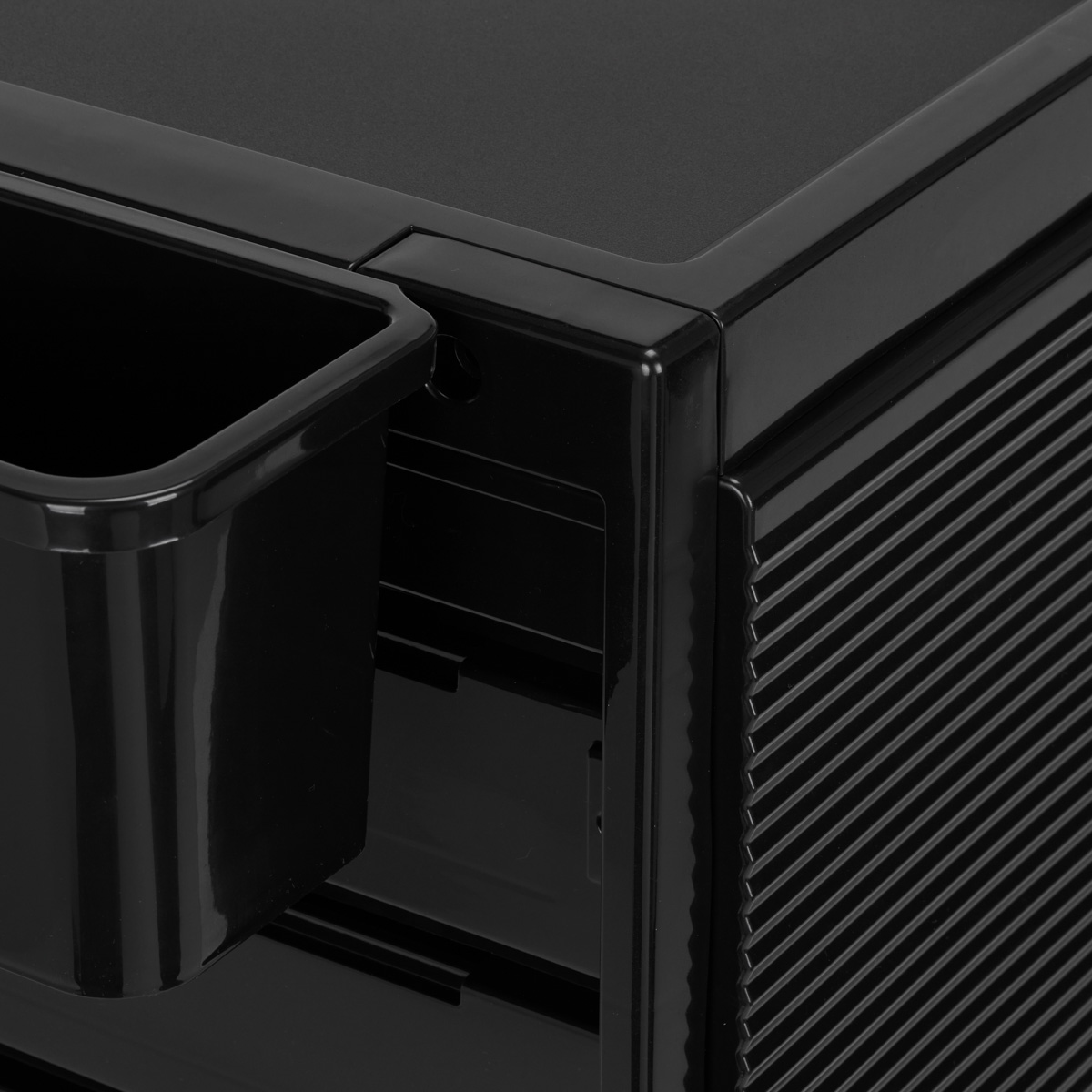 Pojemny organizer wyposażony jest w zestaw kuwet, które pomogą zadbać o porządek w miejscu pracy, posegregować odpowiednio niezbędne w pracy fryzjera przybory. W zestawie znajduje się sześć pojemników: dwa bez przegródek, dwa z przegródkami oraz dwa wąskie i głębsze. Ich układ w organizerze można dowolnie zmieniać, dopasowując go do własnych potrzeb, a znaczny wybór różnych typów szuflad pozwala na posegregowanie przyborów według uznania. Dodatkowo dwie najgłębsze kuwety można umieszczać na różnych wysokościach po bokach pomocnika, dzięki czemu ułożone w nich przybory zawsze znajdą się na odpowiednim poziomie. Zabudowany tył zabezpiecza szuflady przed przypadkowym ich wysunięciem w drugą stronę, co mogłoby skutkować uszkodzeniem znajdujących się w nich przyborów.