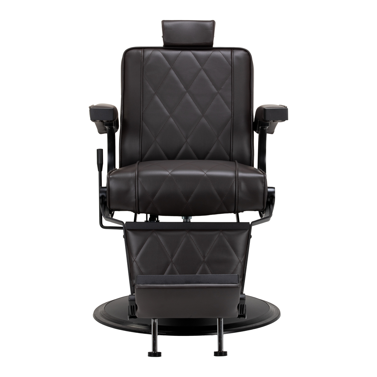 Solidna konstrukcja okrągłej podstawy zapewnia stabilność oraz wysoki komfort użytkowania. Wypełnienie siedziska z odpornej na odkształcenia pianki oraz obicie wykonane z przyjemnej w dotyku skóry syntetycznej o matowym wykończeniu zapewniają trwałość mebla oraz jego komfortowe użytkowanie przez długi czas. Stylowe przeszycia na tapicerce nadają fotelowi charakteru, przywodząc na myśl design motoryzacyjny, co podkreśla jego elegancki wygląd. Sprawiają również, że sprzęt jest odporny na wilgoć, wytrzymały oraz łatwy do czyszczenia. Pokrycie w odcieniach brązu nadaje mu wyjątkowego charakteru, a minimalistyczny styl pozwala mu wpasować się w wystrój każdego salonu barberskiego.