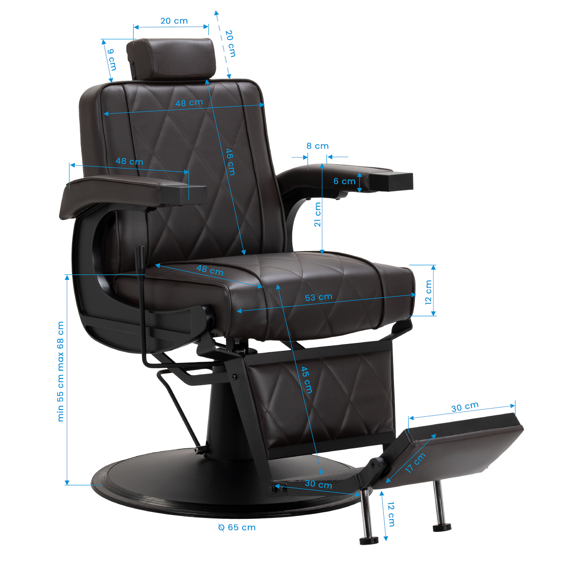Wydajny podnośnik hydrauliczny umożliwia swobodną regulację wysokości siedziska w granicach 55-68 cm, nawet w momencie, gdy klient zajmie już miejsce w fotelu. Gwarantuje to ergonomiczną pracę i ułatwia dopasowanie poziomu siedziska do wzrostu zarówno klienta, jak i osoby wykonującej zabieg. Fotel posiada odchylane oparcie oraz regulowany podnóżek, dzięki czemu możliwe jest ułożenie klienta w dogodnej, półleżącej pozycji. Takie ustawienie gwarantuje lepszy dostęp podczas niektórych usług. Dodatkowo wysuwany o 20 cm zagłówek zapewnia doskonałe podparcie głowy.