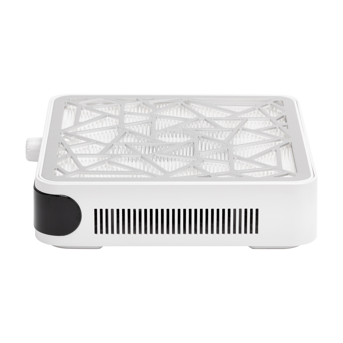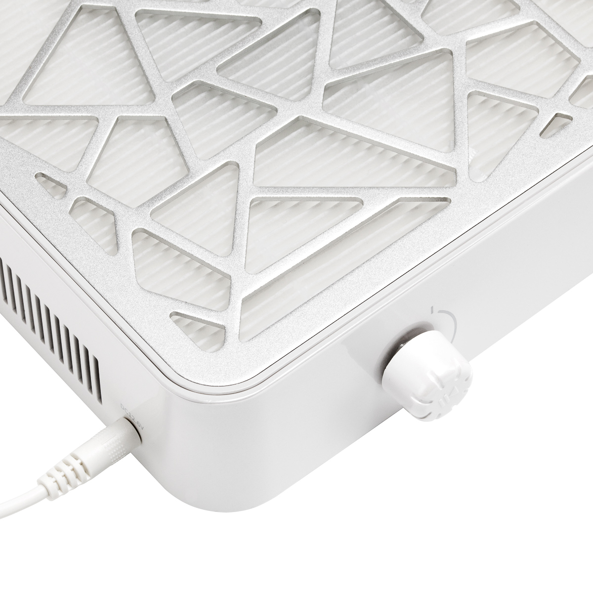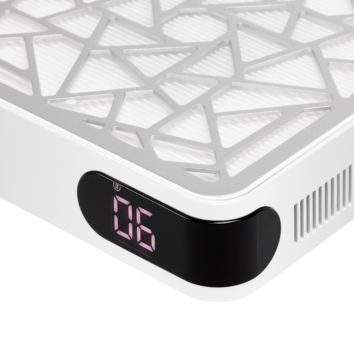 Duża powierzchnia wchłaniania umożliwia wygodne ułożenie obu dłoni nad urządzeniem, a wysoka wydajność pochłaniacza kieruje zanieczyszczenia bezpośrednio do filtra, pozostawiając stanowisko pracy czyste i wolne od pyłu. Otwory wentylacyjne rozmieszczone po bokach zapewniają sprawny przepływ powietrza i stabilną pracę wentylatora przez dłuższy czas, ograniczając ryzyko przegrzania. Czujnik bezpieczeństwa automatycznie zatrzymuje pracę urządzenia i uruchamia sygnał dźwiękowy w przypadku odłączenia maskownicy, zwiększając kontrolę i bezpieczeństwo podczas pracy.