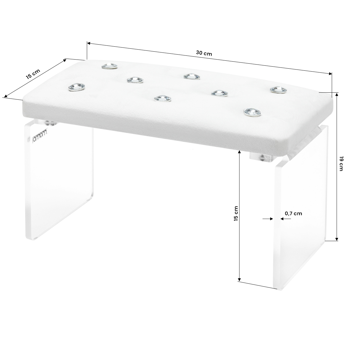 Odpowiednia wysokość podpórki zapewnia wygodną pozycję zarówno dla klienta, jak i dla stylistki. Poprawna postawa stylistki minimalizuje obciążenie kręgosłupa, skutecznie redukując ból pleców, a klientce zapewnia to większy komfort i relaks. Silikonowe elementy na nóżkach chronią blat przed zarysowaniami i zapobiegają przesuwaniu się na stole, gwarantują stabilność. Stelaż z tworzywa sztucznego i elegancki welur zapewniają długą trwałość produktu, a ozdobne kryształki nadają mu wyjątkowy wygląd.